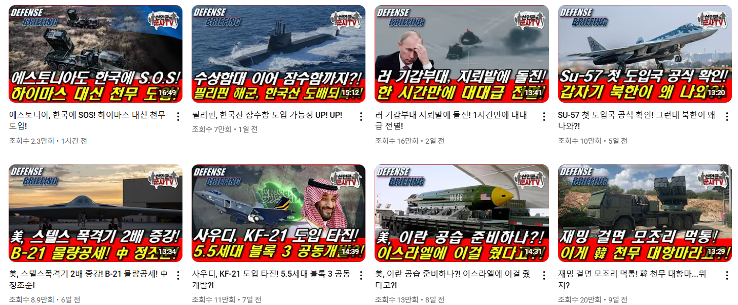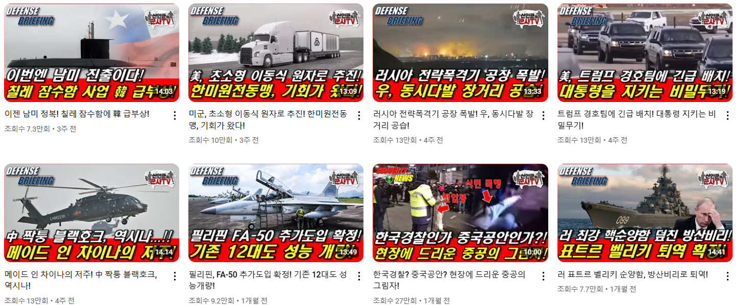 반면 '군사TV'는 해외 군사와 무기에 관한 내용을 주제로 다루고 있습니다. 포스팅 시점 기준 현재 '국방TV'는 약 115만 명의 구독자를 보유하고 있으며, '군사TV'는 약 67만 명의 구독자를 기록하고 있습니다. 신인균은 두 채널 모두 직접 진행하며, 때때로 외부 강연 등으로 인해 대신 진행하는 경우도 있습니다.