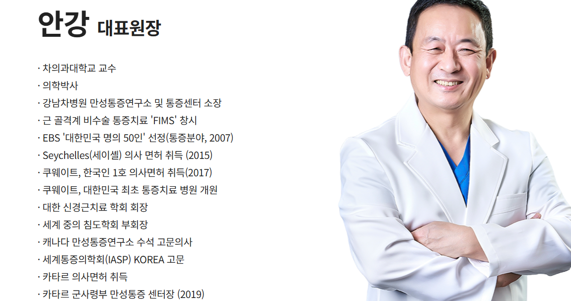 의료 경력 측면에서 안강 의사는 차의과학대학교 교수로 재직하며 교육과 연구를 병행했고, 차병원 만성통증센터 센터장을 맡아 통증 치료 시스템의 체계화를 이끌었습니다. 또한 대한신경근치료학회 이사장으로 활동하며 신경과 근육을 동시에 고려하는 통합적 통증 치료 이론의 확산에 기여했습니다. 캐나다 만성통증 연구소 고문의사로도 활동하며 해외 의료진과의 교류를 통해 국제적 치료 기준과 연구 성과를 국내 의료 현장에 접목시켜 왔습니다.