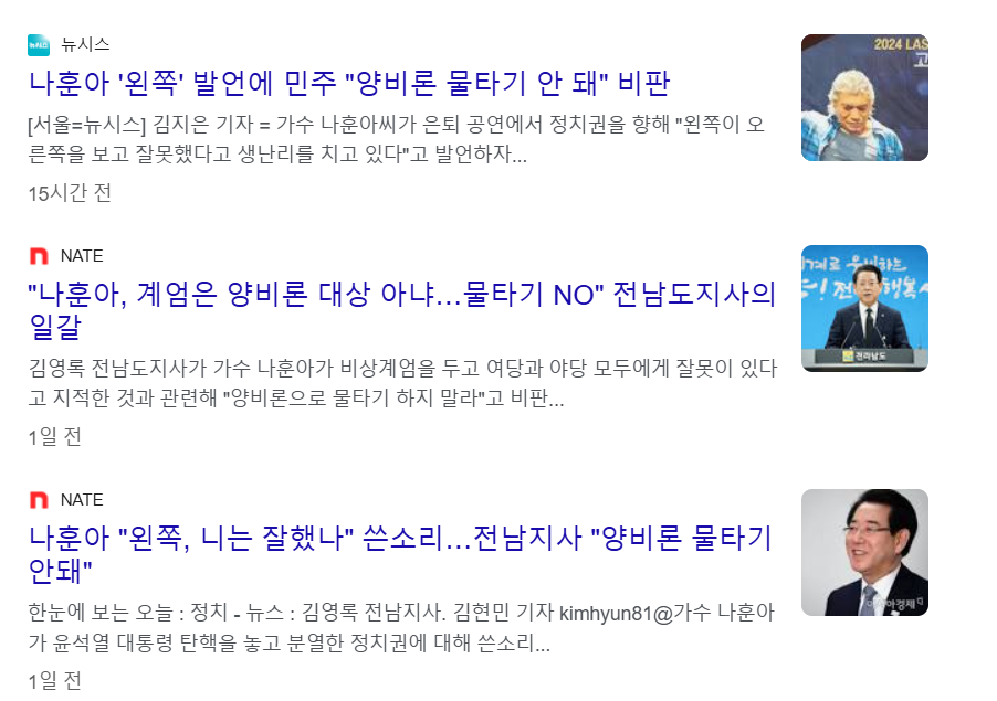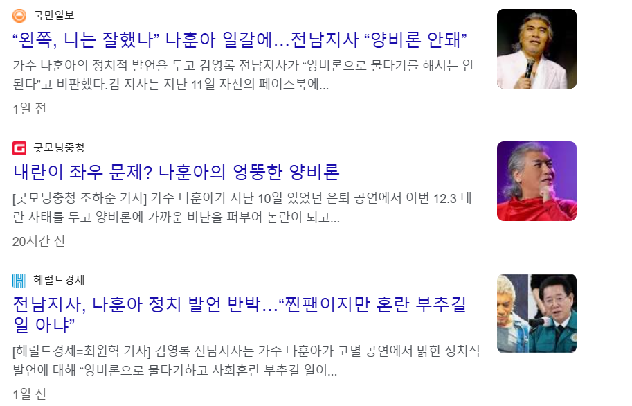 이언주 최고위원은 SNS에서 나훈아의 발언을 비판하며, 윤석열 대통령을 "폭력 공안 사범"이라고 지적했습니다. 김영록 전남도지사는 가수 나훈아가 비상계엄을 두고 여야 모두에게 잘못이 있다고 언급한 것에 대해 "양비론으로 물타기 하지 말라"고 비판했습니다.