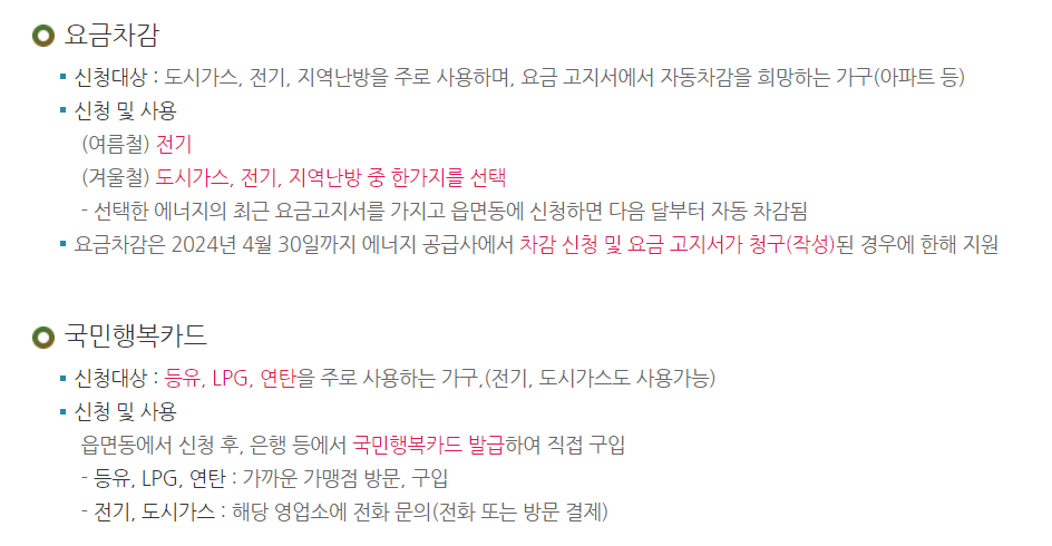 전기, 도시가스, 지역난방등의 에너지 요금에 대해 요금 차감 방식으로 진행된다는 점 참고하시기 바랍니다. 국민행복카드를 사용한다면 등유, LPG, 전기, 도시가스, 연탄등을 바우처로 사용가능합니다.