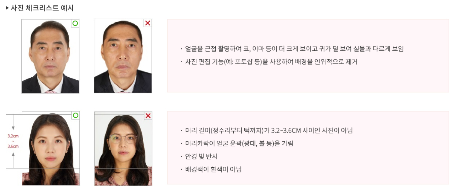 또한 여권위조등에 대비하기 위하여서 얼굴이 사진에 꽉 채워지도록 촬영된 사진이어야 합니다. 이러한 사진 규정에 의하여 직접 촬영은 하는 것은 사실상 어려우므로 사진관등을 이용하는 것을 추천드립니다.