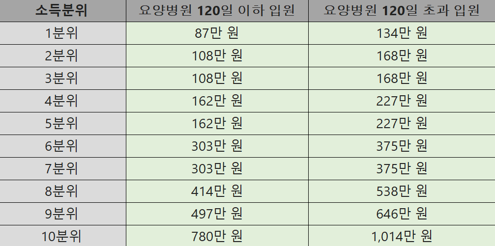 크게 저속득자인지 고소득자 인지에 따라서 1분위부터 10분위까지 구별됩니다. 그리고 요양병원에 120일 초과입원인지 이하 입원인지에 따라서 금액이 다르게 됩니다. 크게 다음과 같습니다.