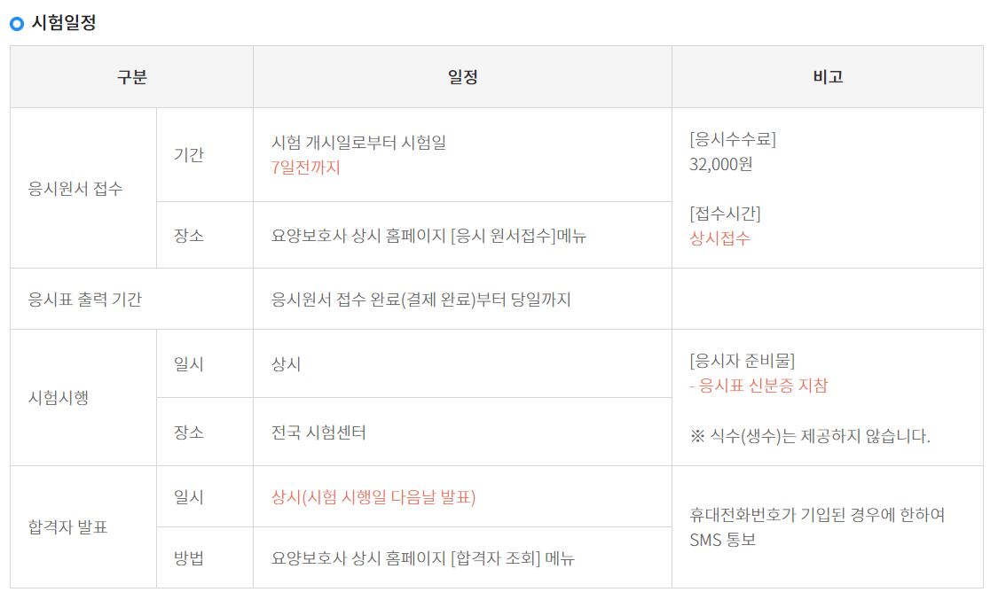 따라서 시험에 떨어졌다고 낙심하지 마시고 다시 준비하셔서 바로 응시를 하시면 됩니다. 시험은 요양보호개론, 요양보호관련 기초지식, 기본요양보호각론 및 특수요양보호각론 3가지의 과목을 시험을 치루며 객관식 5지 선다형 35문항 시험입니다. 35점에 시험시간은 90분입니다. 실기는 객관식 5지선다형 45문항을 치루며 90분 동안 진행됩니다.