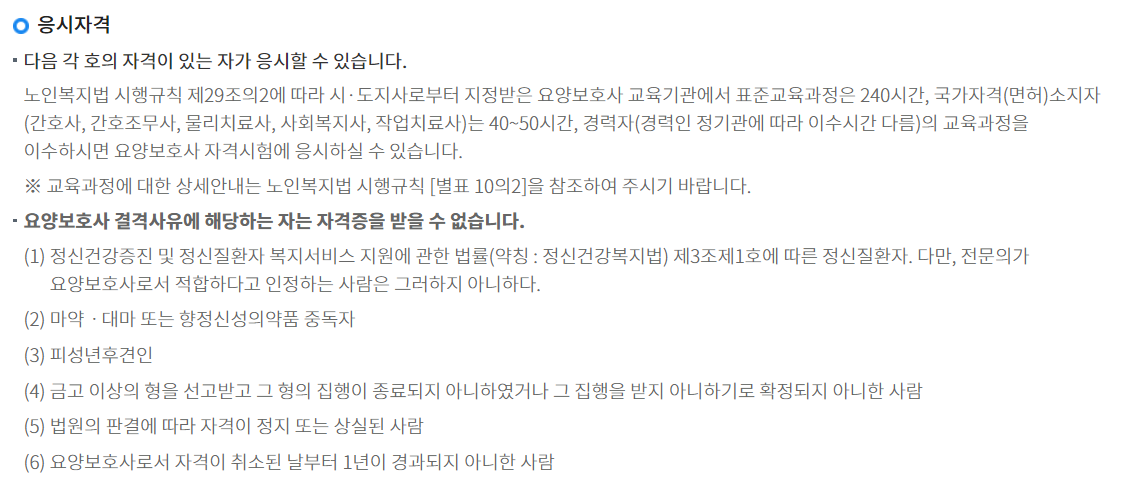 교육은 주간반과 야간반이 있으며 주간반은 약 한달정도 야간반은 2개월 정도의 시간이 소요될 수 있습니다. 외국인 또한 응시가 가능합니다. 요양보호사 지정 교육기관에 등록을 하시면 어디에서 실습을 받으셔야 하는지 안내를 도와주며 시험 기출문제라든가 시험접수를 위한 과정등을 대행해주기도 합니다.