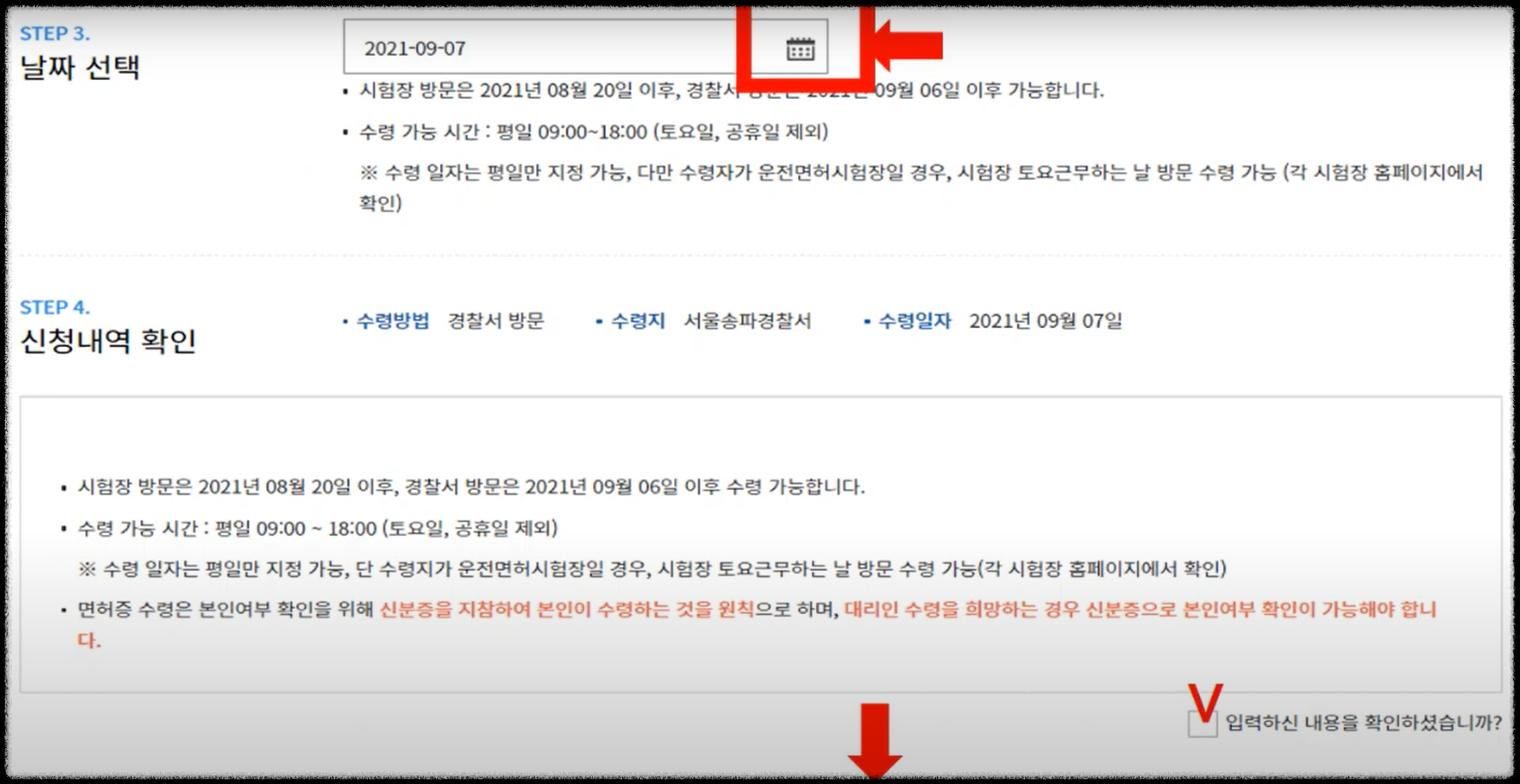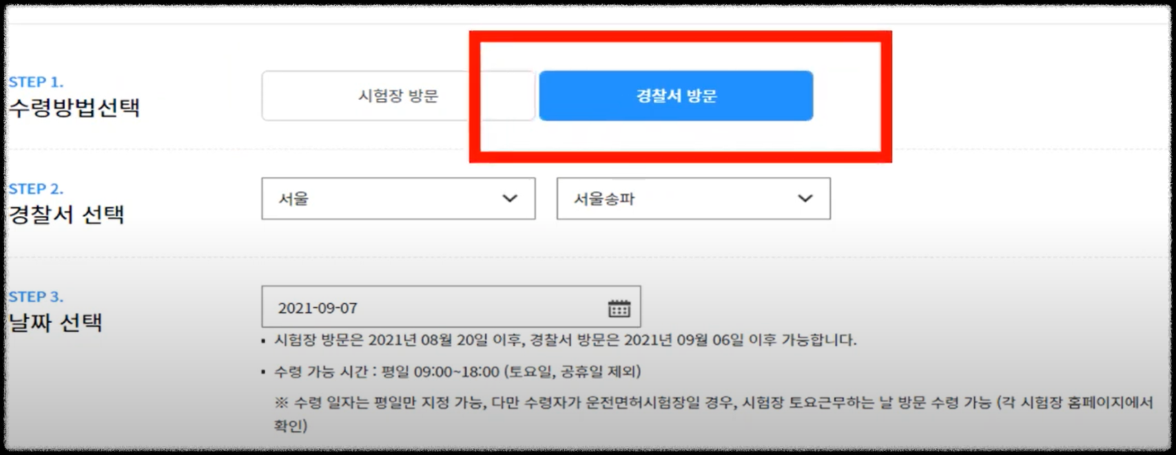 5. 수령지 및 날짜 선택 (시험장 또는 경찰서 방문 선택)