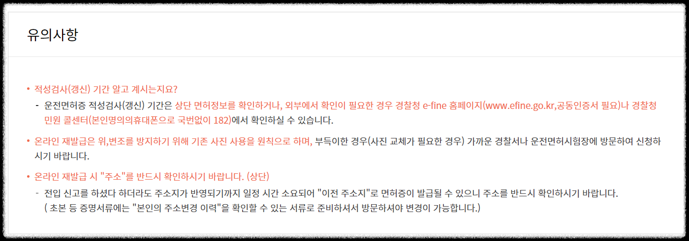 다시한번 안내해 드리지만 운전면허증 재발급 시 필요한 준비물은 특별한 것은 없으며 본인 신분증과 재발급 수수료만 준비하시면 됩니다. 온라인 재발급 시 사진 변경 불가하지만 온라인 갱신 시 사진 변경 가능합니다.