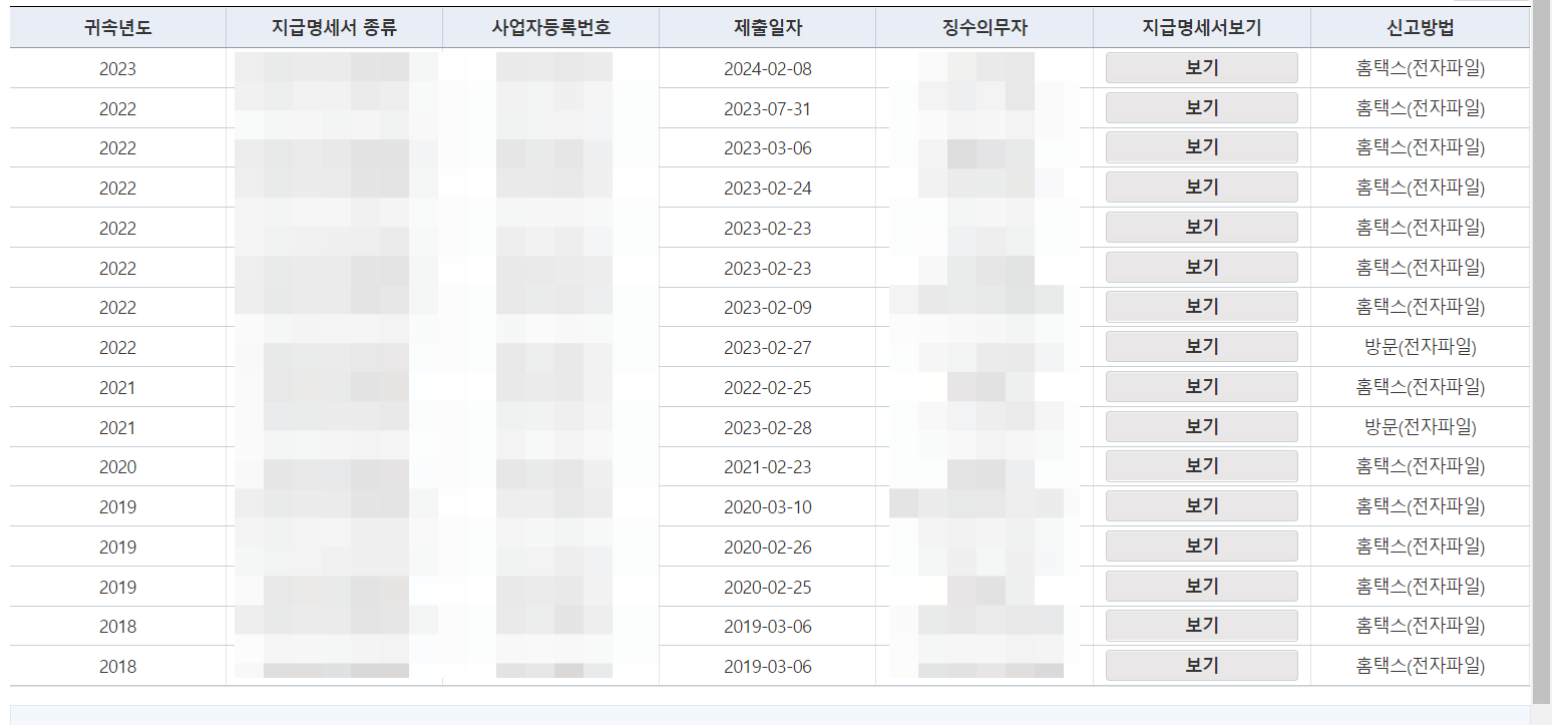 클릭하시면 지급명세서등 제출내역이 귀속년도, 지급 명세서 종류, 사업자등록번호, 제출일자, 징수의무자, 지급명세서 보기, 신고방법등으로 화면이 표시됩니다.