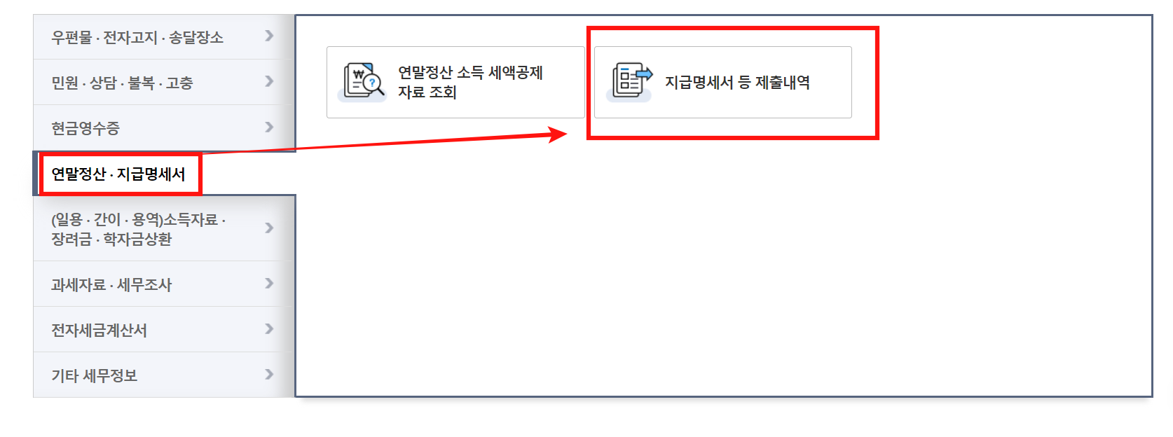 로그인이 모두 완료되셨다면 좌측의 연말정산 지급명세서 메뉴를 클릭하시면 연말정산 소득 세액공제와 지급명세서 제출내역 2가지의 메뉴가 보이며 우측의 지급명세서 제출내역을 클릭합니다.