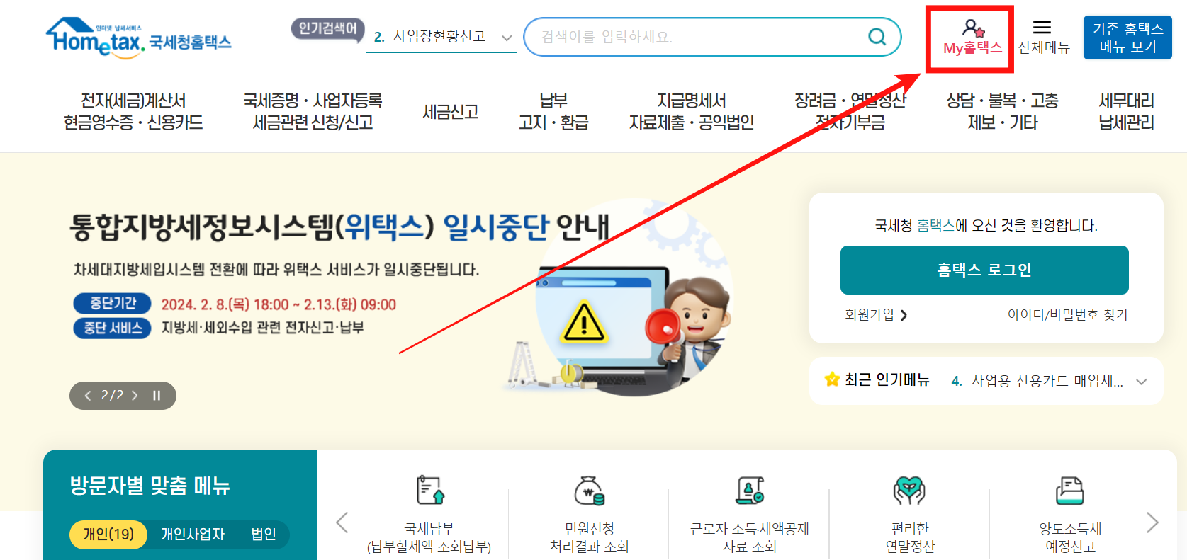 인터넷 발급 방법은 먼저 홈택스 사이트에 접속하신후에 로그인을 진행합니다. 홈페이지 우측 상단에 MY 홈택스로 메뉴를 클릭하시면 로그인 화면이 나오게 됩니다.