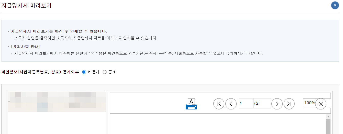 우측 두번째의 지급 명세서 보기의 보기를 클릭하시면 상세한 내역을 확인해 보실수 있습니다. 해당 내역은 엑셀로 내려받으실수도 있으며 프린트로 인쇄도 가능합니다.