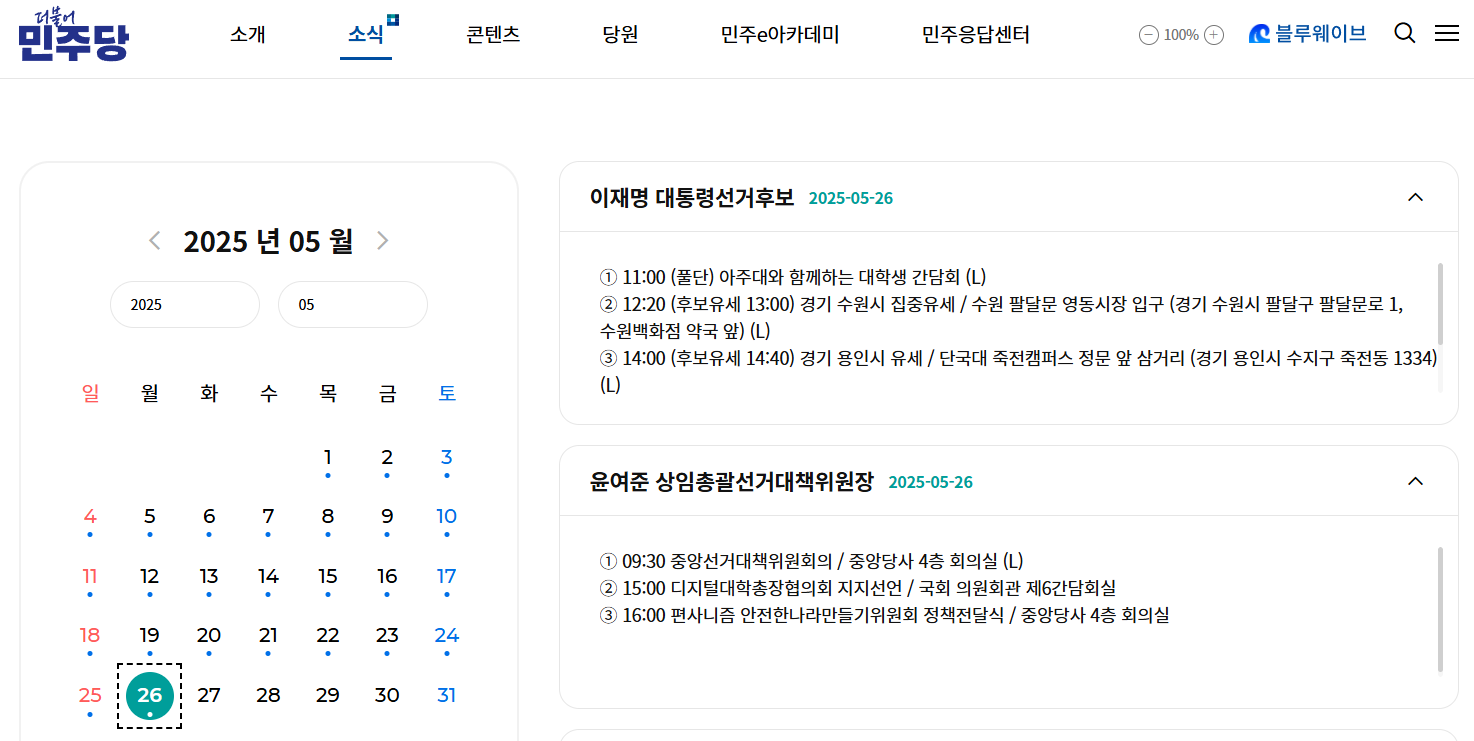 각 일정에는 유세 시작 시간, 장소, 주요 참석자, 그리고 특별 간담회나 토론회 등 부대행사 정보도 함께 안내되고 있습니다. 혹은 델리민주 공식 유튜브 채널의 게시물을 확인하시면 일정을 보실수 있습니다.