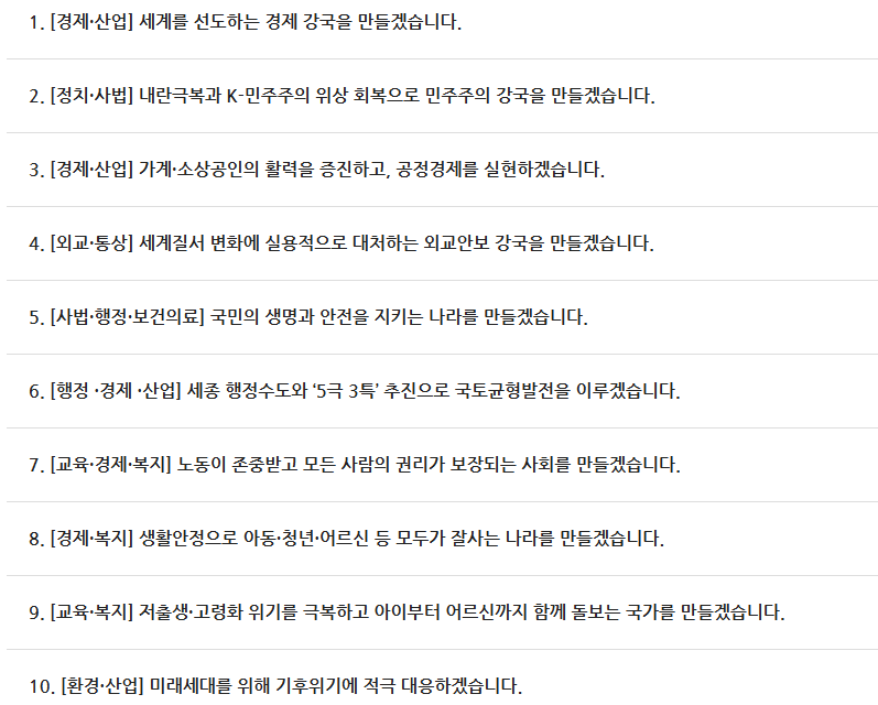 이를 위해 AI 등 신산업 집중 육성과 K콘텐츠 지원 강화로 세계를 선도하는 경제강국 실현 가계와 소상공인 활력 증진 외교안보 강국 설립 재난 대응 강화 세종 행정수도 완성 등 국토균형발전 미래세대를 위한 기후위기 대응 등 10대 정책 공약을 내세웠습니다.