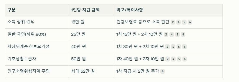 (연봉 약 7,700만 원 이상, 건강보험료 납부액 등으로 산정) 일반 국민(소득 하위 90%): 1인당 25만 원 (1차 15만 원, 2차 10만 원 추가 지급)