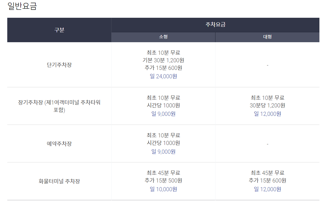 현재 인천 공항의 일반요금은 단기, 장기, 예약, 화물 주차장으로 구분되어 있으며 요금은 소형과 대형으로 구별됩니다. 아래의 사진을 먼저 참고해 보시기 바랍니다.