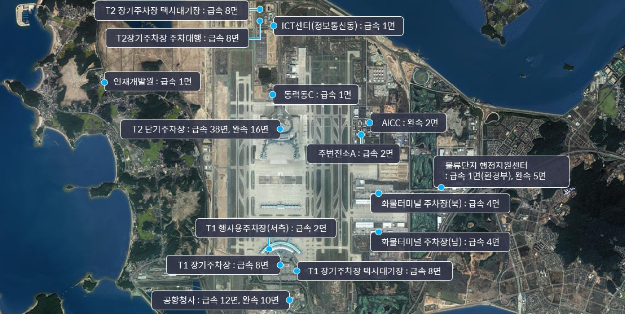 또한 제1여객터미널 인천 국제공항공사 주차장과 제2여객터미널 제2 합동청사 주차장은 단기주차장 주차요금이 적용되고 있으니 참고하시기 바랍니다. 전기차 충전소의 경우 아래와 같이 설치되어 운영중에 있습니다.