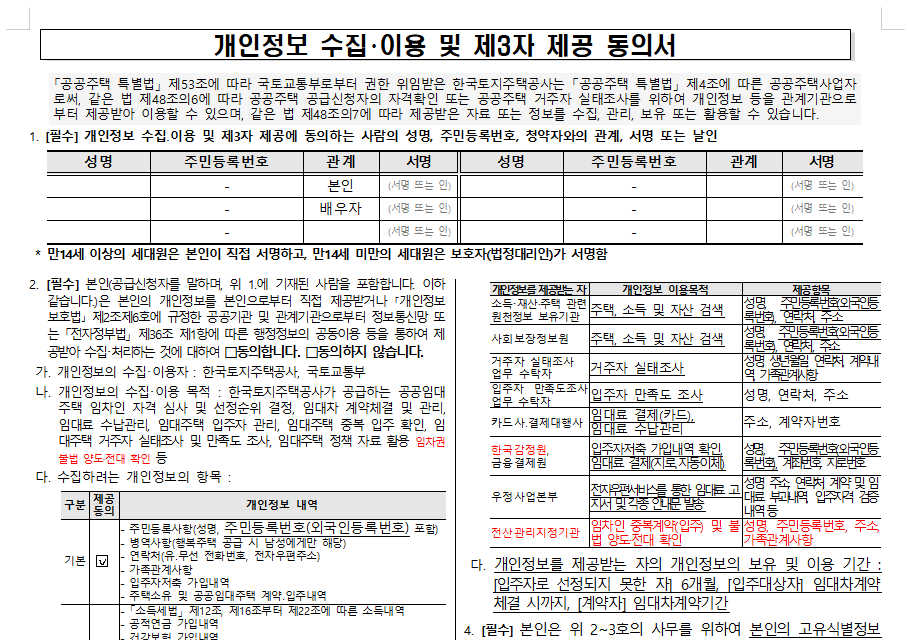 임대아파트 필요서류는 기본적으로 개인정보 및 제3자 제공 동의서가 있습니다. 또한 주민등록표초본과 등본, 가족관계증명서 청약통장 가입 확인서와 신분증등이 필요할 수 있습니다.
