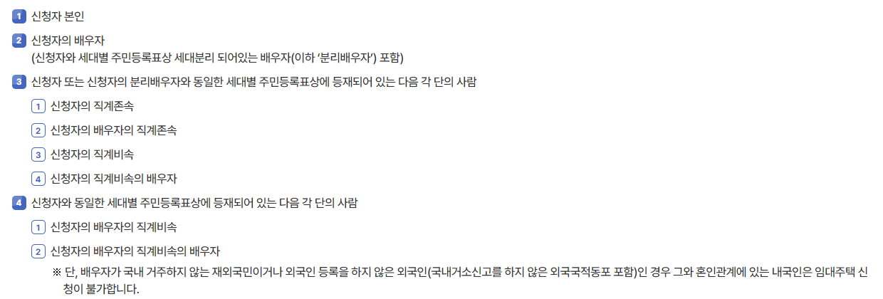 첫번째는 무주택자이어야 합니다. 무주택자라는 것은 말그대로 주택을 현재 소유하고 있지 않은 사람을 말하고 있습니다. 무주택자의 기준은 신청자 또는 신청자의 배우자, 직계존속, 직계비속등을 기준으로 합니다.