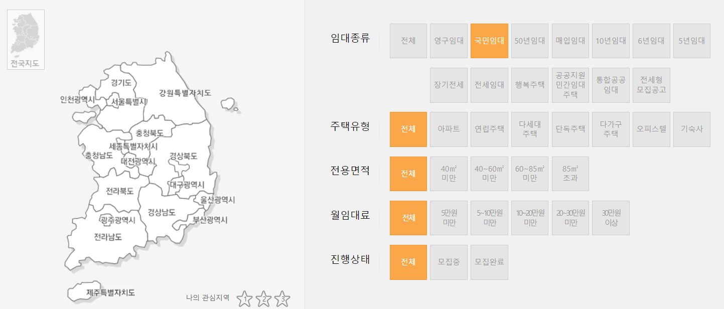 모집공고의 경우 공사의 국민임대주택 홈페이지나 마이홈 포털을 이용하실수 있습니다. 모집 공고를 확인하셨다면 청약을 원하시는 지역을 선택하시고 주택 유형, 공급 구분을 선택합니다.