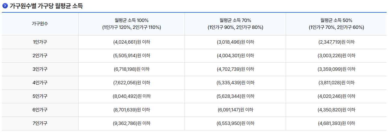 전년도 도시근로자 가구원수별 월평균소득의 70% 이하를 현재 기주으로 하고 있습니다. 1인가구 90% 그리고 2인가구 80%가 기준입니다.