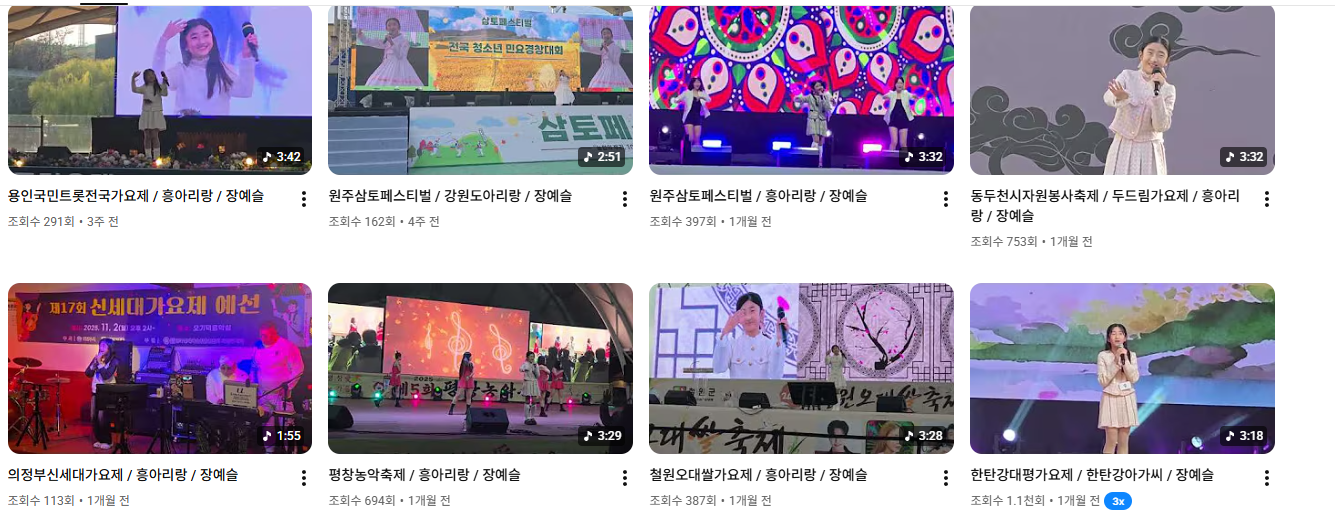 트로트를 향한 그녀의 애정은 매우 일찍부터 시작되었습니다. 유튜브에 남아 있는 초기 영상들만 살펴보아도 9살 무렵부터 무대에 서며 자신의 목소리로 노래를 표현하는 데 익숙한 모습을 보여줍니다. 또래 아이들이 접하기 어려운 트로트 특유의 리듬과 감정선을 완전히 체득해가는 과정이 자연스럽게 기록되어 있으며, 이 경험들이 현재의 자신감과 무대 매너로 이어지고 있습니다. 지역 축제에서 관객과 호흡하는 장면, 연습실에서 열심히 곡을 소화하는 모습 등은 장예슬이 단순한 화제성 인물이 아니라 실제 실력을 바탕으로 성장하는 가수임을 보여줍니다.