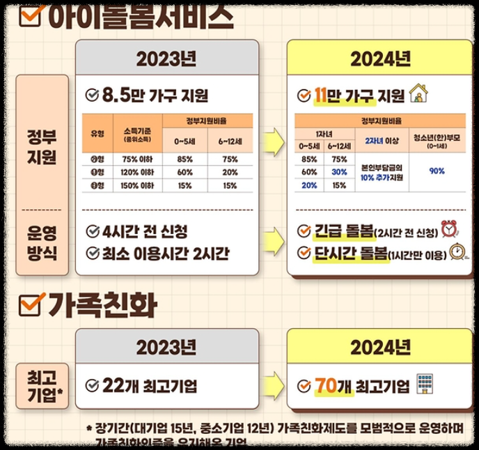 또한 외국인 가사도우미를 도입하여 가정 내 돌봄 환경을 지원하고, 대체인력 확보에 어려움을 겪는 중소기업에 대한 지원도 강화될 예정입니다.