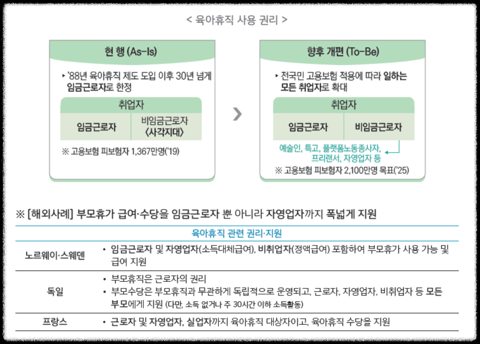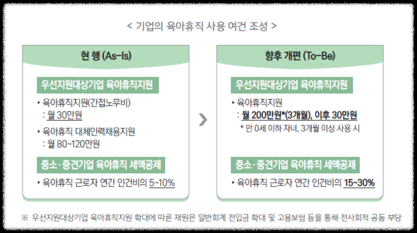 육아기 근로 시간 단축이 가능한 자녀 연령을 확대하고, 단기 육아휴직 제도를 도입하여 부모의 육아 부담을 덜어준다는 계획입니다.