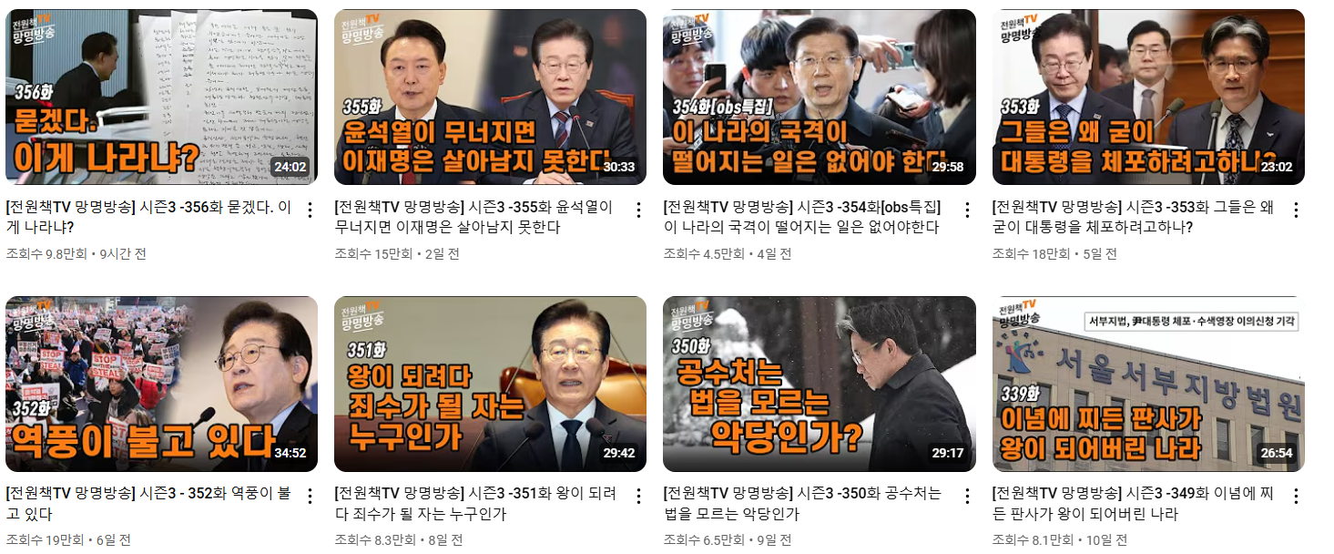 또한, 삼성 상속 문제나 정경유착에 대해 비판적인 태도를 보여 재벌 중심의 경제 운영을 옹호하지 않는 모습을 보였습니다. 현재는 현재는 전원책TV망명방송이라는 유튜브 채널을 운영하고 있으며, 2024년 4월 7일 기준으로 구독자 수는 36.4만 명입니다.