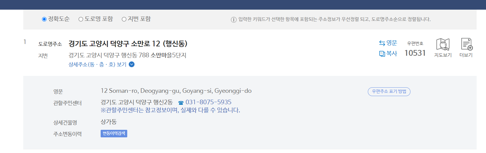 주소입력후에 우측의 더보기를 클릭하시면 관할 주민센터 정보가 아래와 같이 표시가 됩니다.