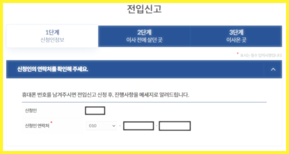 신청인정보를 입력하신후에 이전에 살던곳 정보를 입력하시고 이사온 곳의 정보를 입력하시면 되며 총 3단계로 쉽게 진행이 가능하도록 구성되어 있습니다.