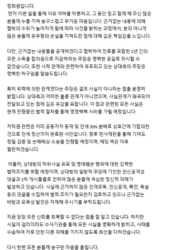 또한 스토킹 고소는 저작권 협의를 위한 단발적 방문을 문제 삼은 것이며 잠정 조치는 혐의 인정과 무관하다고 밝혔습니다.