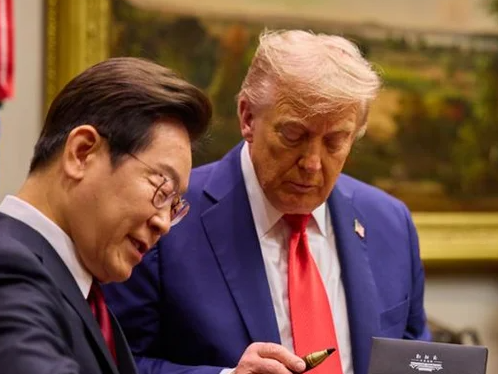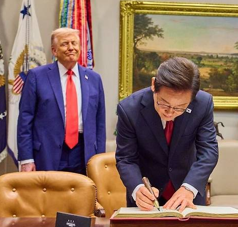 이재명 대통령은 정상회담 서명식에서 갈색빛의 두껍고 묵직한 만년필로 방명록에 서명한 뒤, 트럼프 대통령이 펜을 보고 “직접 대통령이 가져오신 것인가”라고 묻자 “맞다”고 답하며 그 자리에서 펜을 선물했습니다.