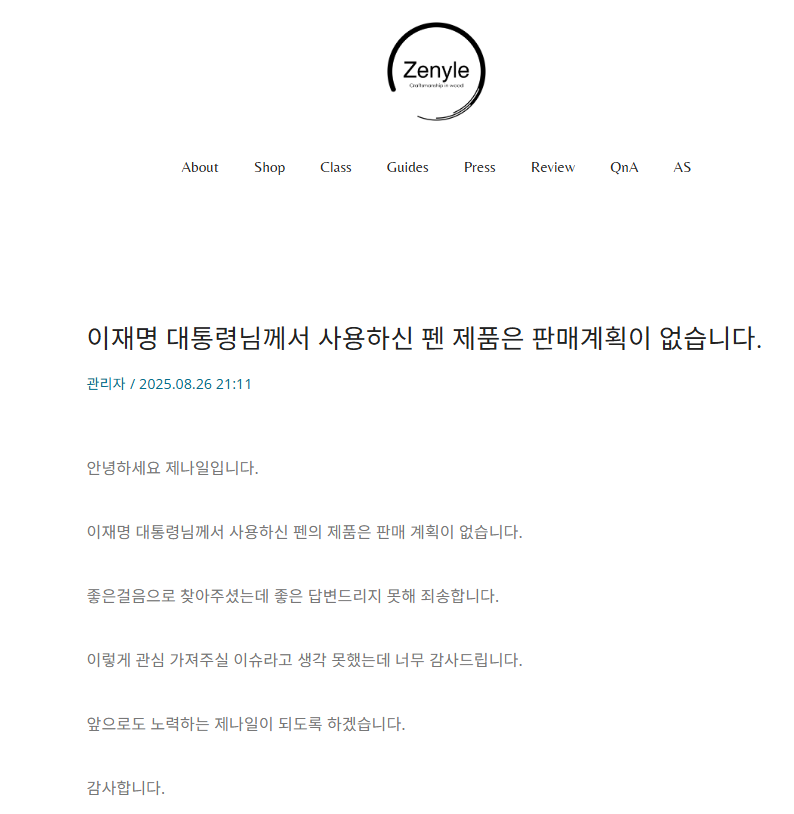 트럼프 대통령은 “사용하지는 않겠지만, 매우 소중하게 간직하겠다”고 화답하며 깊은 인상을 보였습니다. 이번 사건으로 제나일 브랜드는 급격한 주목을 받았고, 국내외에서 주문 문의가 폭주했으나 해당 제품은 대통령실 맞춤 주문 제작품으로 일반 판매는 어렵다고 알려졌습니다.