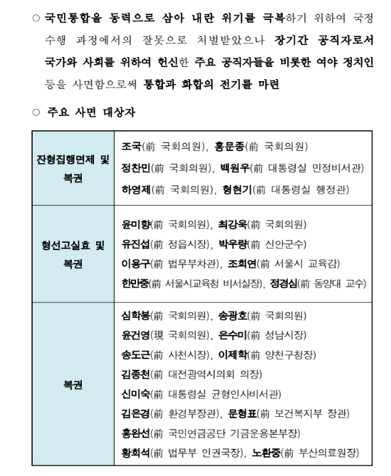 또한 정치인 사면에 관심이 집중된 가운데, 서민 생계형 범죄자와 소외계층에 대한 배려가 포함되어 있음을 강조하였으며, 법무부 사면심사위원회의 엄격한 심사 절차를 거쳐 결정되었음을 알렸습니다.