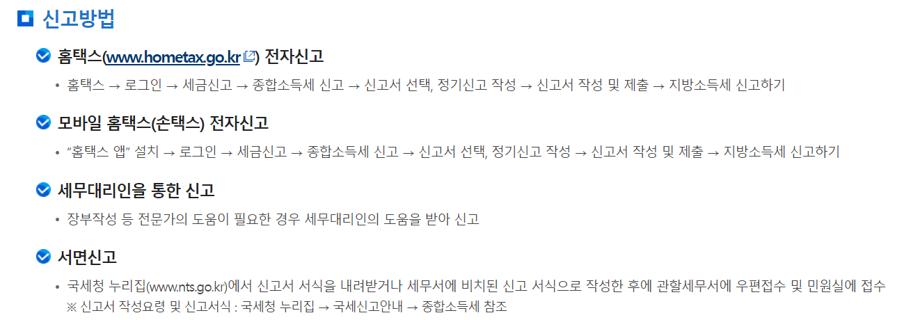 종합소득세는 국세청 홈페이지 또는 모바일 손택스를 통해 온라인으로 종합소득세를 신고할 수 있습니다. 또는 거주하시는 곳의 관할 세무서를 방문하여 종합소득세를 신고할 수 있습니다.