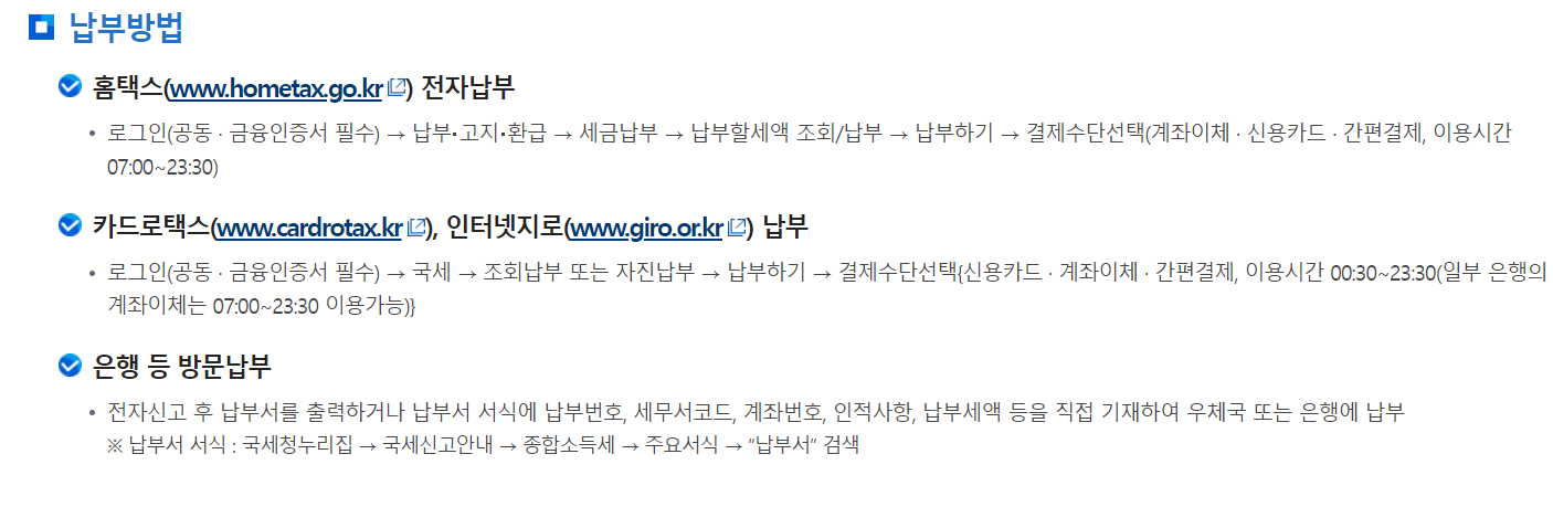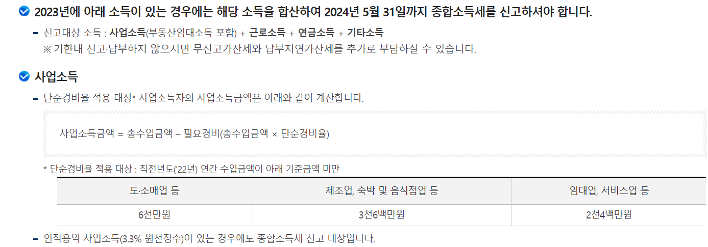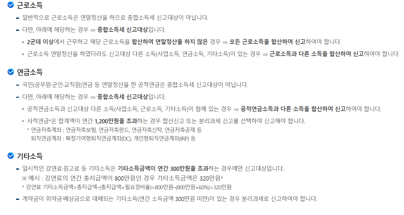 위의 조건에 해당하지 않는 종합소득에 해당하는 소득이 있는 경우, 종합소득세를 신고하고 납부해야 합니다.