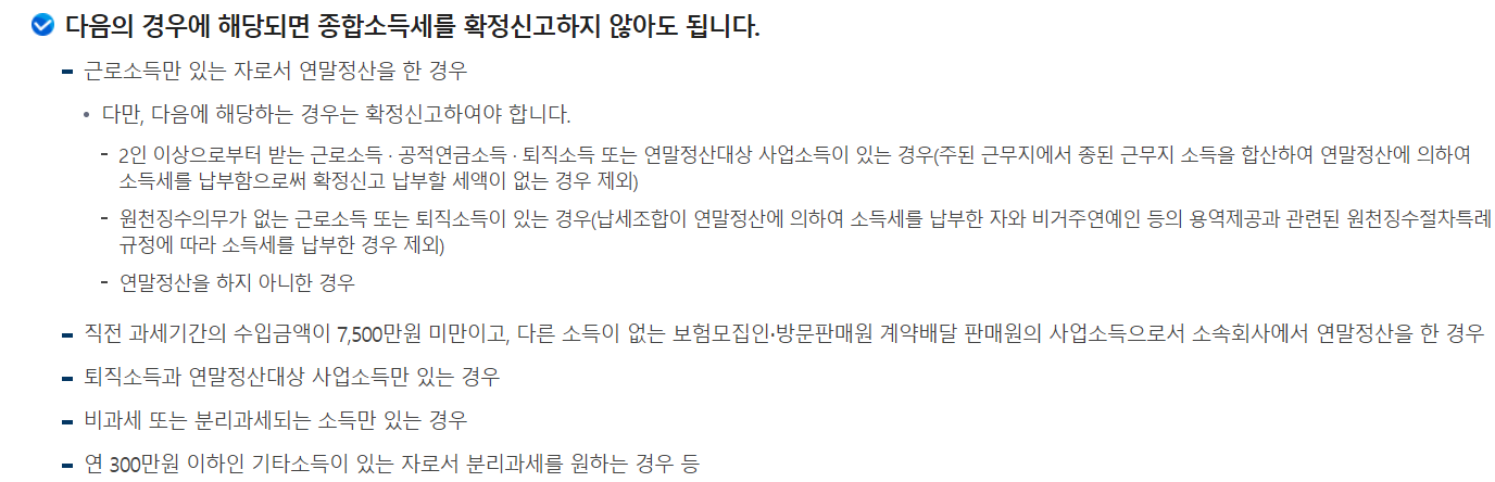 다음으로 직전 과세 기간의 수입이 7500만 원 미만이며 방문판매원등 소속회사에서 연말정산을 한 경우입니다. 퇴직소득과 연말정산대상 사업소득만 있는 경우나 비과세 또는 분리과세되는 소득만 있는 경우입니다.