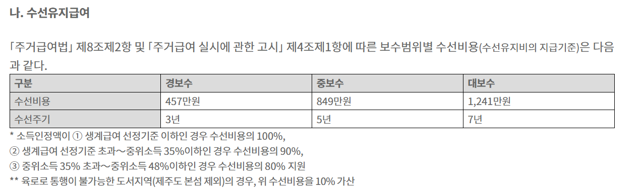 중위소득 35% 초과하면서 중위소득 48%이하인 경우 수선비용의 80%가 지원됩니다. 참고로 육로로 통행이 불가능한 도서지역 의 경우라면 위 수선비용을 10% 가산하도록 합니다.