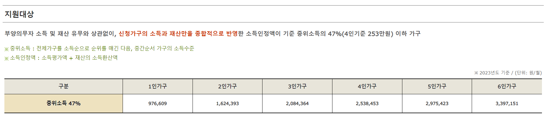 내년도의 변화되는 가장 큰 포인트를 살펴보겠습니다. 기존에 경우 소득인정액이 중위소득 기준 47% 이하여야 하였지만 내년도인 2024년도부터는 48% 이하로 변경됩니다.