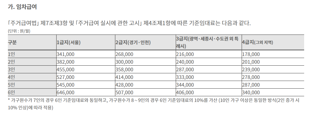 또한 광역시나 세종시의 경우 3급지이이며 이외는 4급지에 해당합니다. 지역마다 부동산 가격이 모두 다르며 이에따라서 지원되는 기준이 모두 상이하다고 보실수 있습니다. 기준임대료의 기준은 다음과 같습니다.