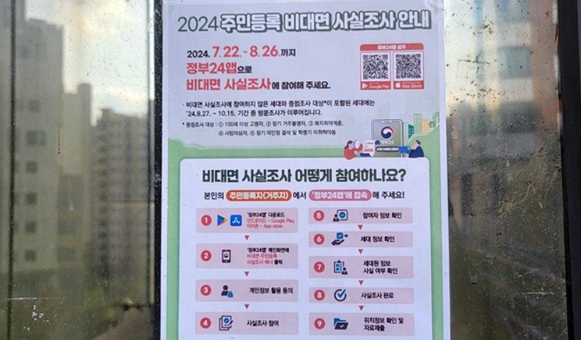 전국민이 대상이므로 8월 26일까지 '정부24' 앱으로 비대면 조사에 참여하면, 중점 조사 대상이 아니라면 방문 조사를 받지 않습니다. 비대면 조사에 참여하지 않았거나 중점 조사 대상에 해당한다면, 8월 27일부터 이·통장 및 읍·면·동 공무원의 방문 조사를 받게 됩니다.