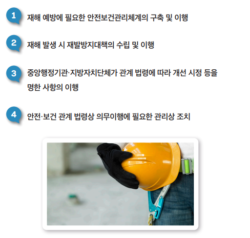 안전에 대한 의식과 투자를 강화하고 예방하며 근로자들을 보호하는 것에 그 목적을 두고 있다고 볼 수 있습니다. 사망의 경우 1년 이상의 징역 또는 10억 원 이하의 벌금에 법적 처벌을 받을수 있습니다.