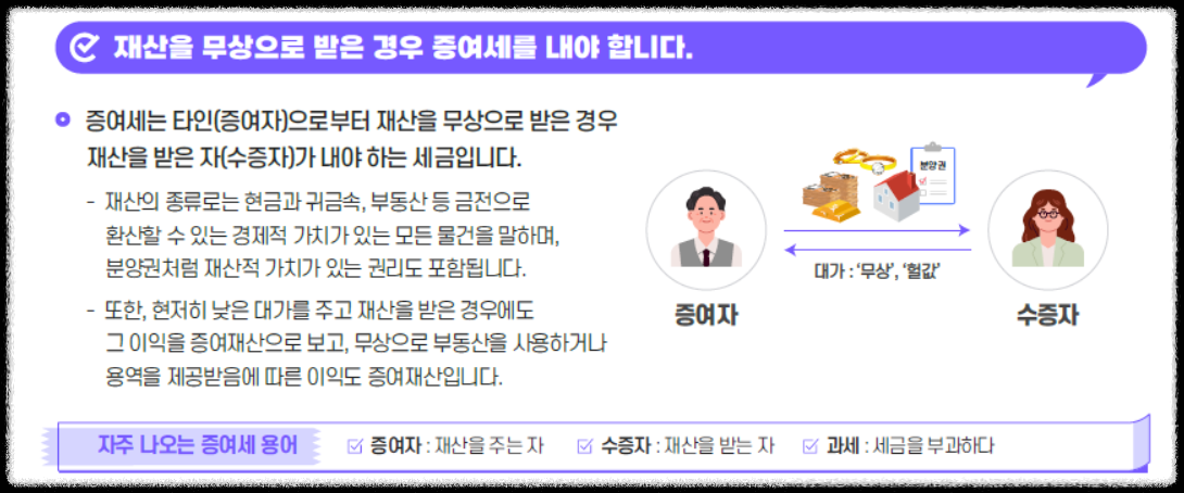 증여세란 국세의 한 종류인 증여세는 상속세와 함께 무상으로 재산을 받을 때 부과되는 세금입니다. 단순히 주는 행위에 대한 세금이 아니라, 받는 사람에게 부과되는 세금이라는 점을 꼭 기억해야 합니다.