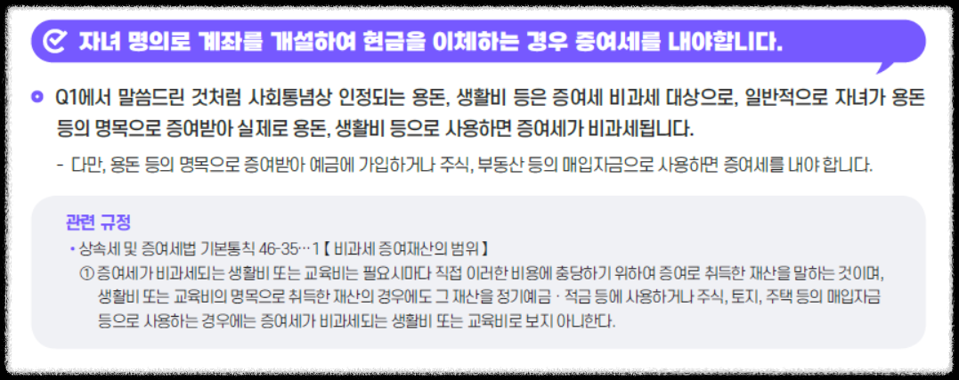 최근 세법 개정으로 가족 간의 계좌 이체도 증여로 간주될 수 있으니 주의가 필요합니다. 부모 자식 간, 부부 간에도 증여가 아님을 증명하지 못하면 세금을 낼 수 있습니다.