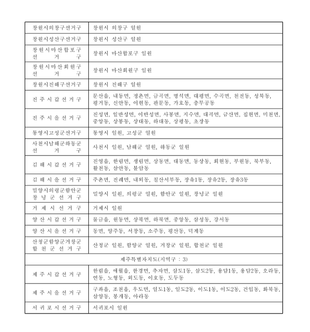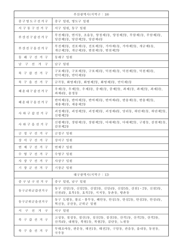 부산은 18석 대구 12석 광주 8석 대전 7석 울산 6석 세종 2석 강원 8석 충북 8석 충남 11석 전북 10석 전남 10석 경북 13석 경남 16석 제주 3석입니다.