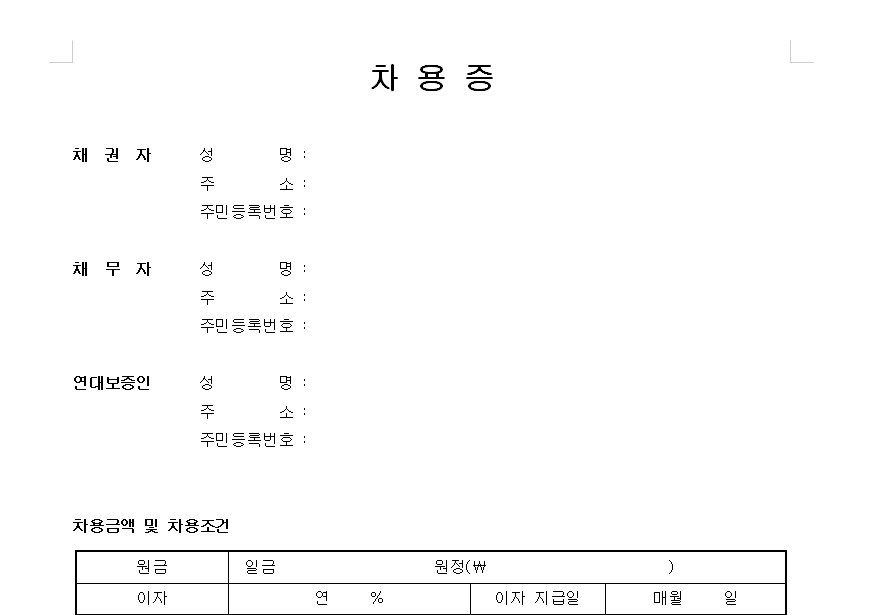 차용증은 채권자가 채무자에게 돈이나 물건을 빌려주면 채무자는 약정한 기일까지 원금과 이자를 변제하기로 약정하는 문서입니다. 차용증은 채권자가 채무자에게 돈이나 물건을 빌려준 사실을 증명하는 중요한 증거가 될수 있습니다.