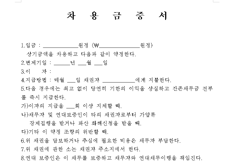 오늘 포스팅에서 안내해 드린 내용을 바탕으로 직접작성하셔도 되며 작성이 어렵거나 차용증 무료 양식이 필요하신 분들의 경우 아래에서 소개해 드리고 있는 무료 양식 서식을 다운로드 받으셔서 사용해 보시기 바랍니다.