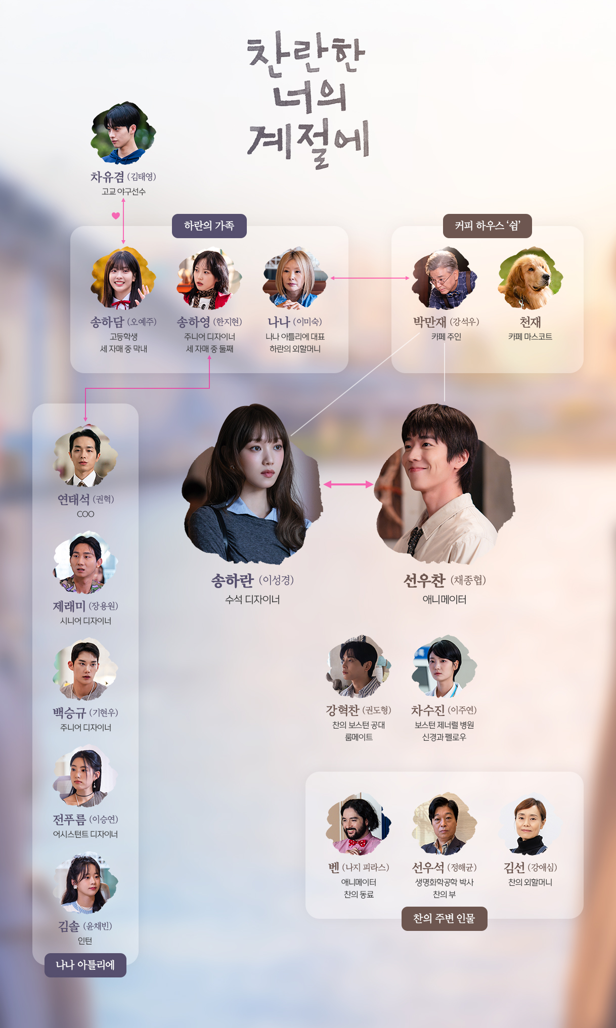 이처럼 『찬란한 너의 계절에』는 각각의 등장인물이 가족의 구성원이자 나나 아틀리에의 일원으로, 서로의 관계와 감정을 통해 이야기의 깊이를 더해갑니다. 송하란과 선우찬의 사랑 이야기는 냉정과 따뜻함, 차가움과 여유로움이 서로를 이해하고 조화를 이루는 과정을 보여주며, 가족과 주변 인물들의 관계를 통해 인간관계의 온도와 감정의 변화를 섬세하게 묘사합니다.