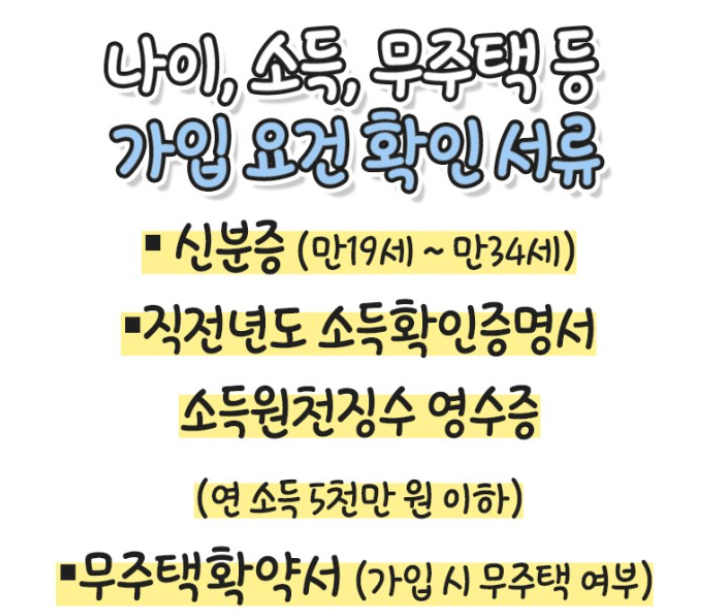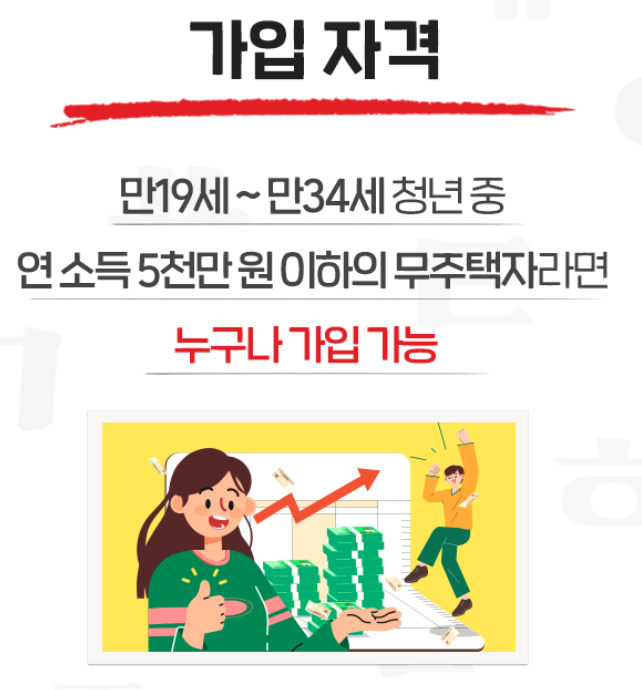 신청 연령은 만 19세 ~ 34세(단, 병역 이행 기간 최대 6년 추가 인정)입니다. 소득 기준은 연 소득 5천만 원 이하(근로, 사업, 기타 소득 모두 포함) 입니다.