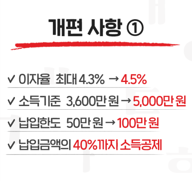 월 납입 한도도 늘어났고, 계약금 납부 목적으로 회 중도 인출까지 가능해졌습니다. 잠깐 소개해 드리면 연 납입금의 300만원까지 40% 소득공제를 받을 수 있습니다.