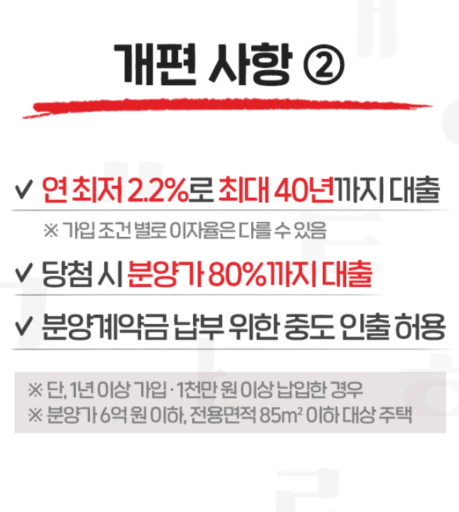 청년 주택드림 청약통장은 가입 혜택뿐만 아니라, 청약 당첨 후에도 특별한 금융 지원을 제공합니다. 청년주택드림청약통장을 사용하여 청약에 당첨된 자라면 최저 2.2% 금리 (소득 및 만기별 차등 적용)로 최대 40년 만기조건하에 분양가의 최대 80%까지 돈을 빌리실수 있습니다.